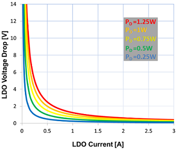 下图显示的是特定功耗值下输入、输出电压差与负载电流之间的关系曲线。