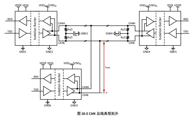 CA-IS2062A 逻辑侧的 DC-DC 转换器电源 VDDP 采用+5V 单电源供电,逻辑电源 VDDL 支持 2.5V 到 5.5V 供电范围,VDDL 和 VDDP 分开可以使用不同电压供电,方便和低压控制电路的信号交互。若 VDDL 使用 5V 电源供电,可以直接和 VDDP 共用一个外部电源。器件的总线侧 VISOOUT由内部 DC-DC 转换器产生 5V 输出电压,为总线侧 CAN 收发器电源 VISOIN 供电,应用中需要把 VISOOUT 和 VISOIN直接短接。