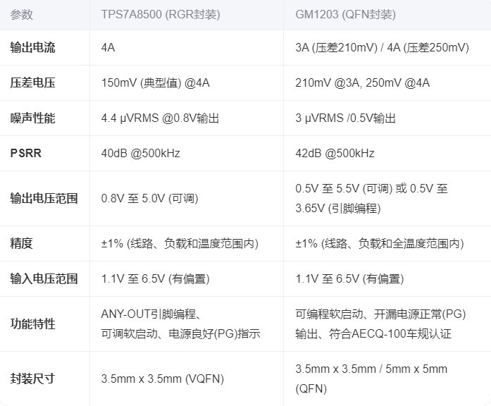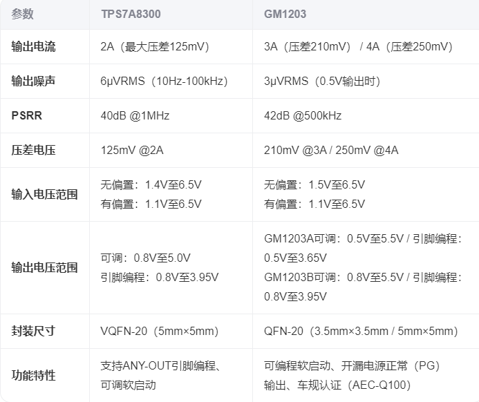 优先GM1203:需高精度、低噪声、大电流(如射频放大器、传感器供电)或车规级应用。