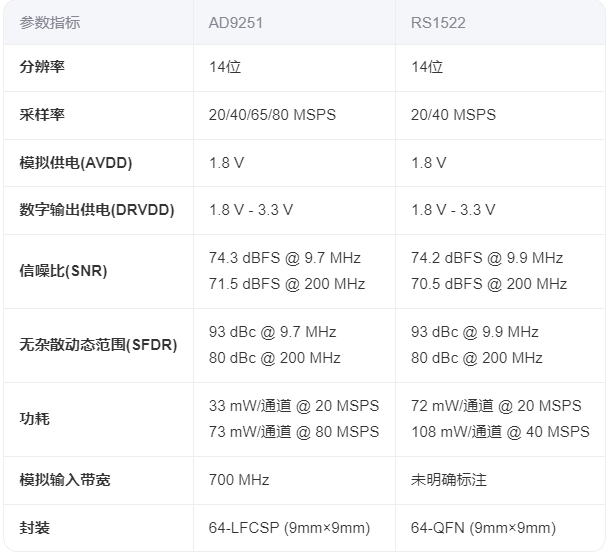 两款14位ADC在核心性能参数上高度接近,AD9251在采样率选择和功能完整性方面更具优势,RS1522在基础应用中提供了可行的替代方案。
