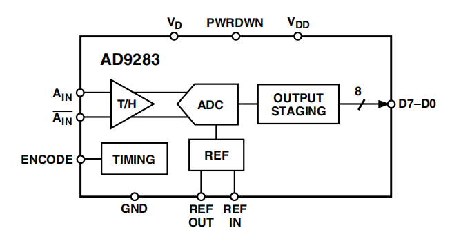AD9283仅需一个3.0V(2.7V至3.6V)电源和一个编码时钟即可实现全性能运行。多数应用场景无需外部参考电压或驱动元件。其数字输出兼容 TTL /CMOS,另设输出电源引脚可支持3.3V或2.5V逻辑接口。
